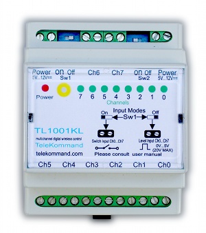 The TL1001KL is a wireless master unit accepting 8 inputs that can be driven by voltage level, mechanical switch or relay. The only configuration required is which kind of inputs to connect, the rest is automatic.